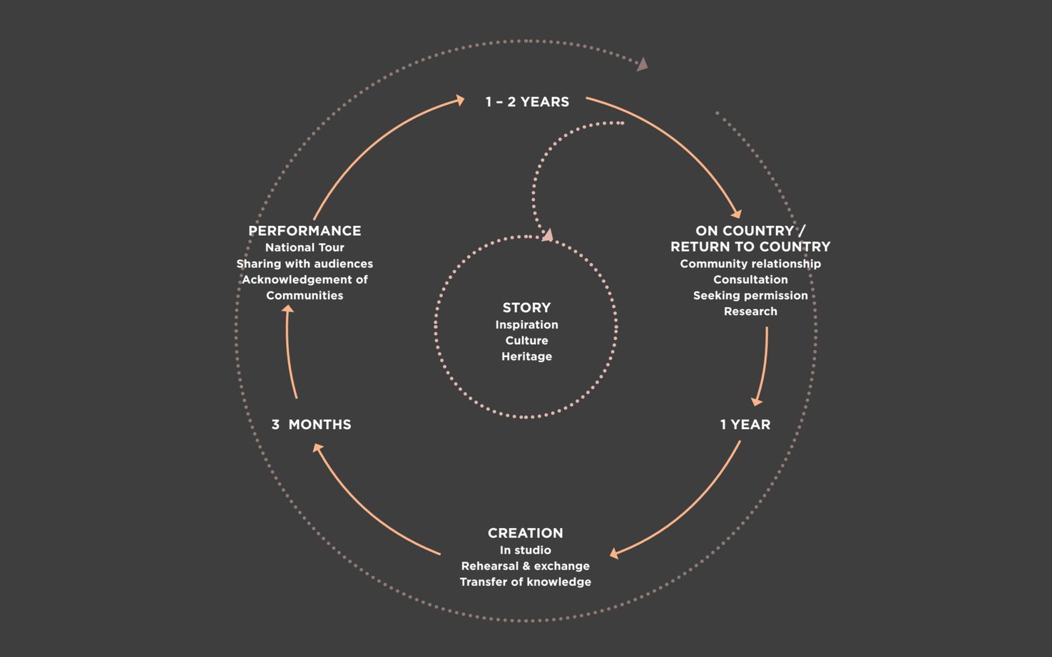 The cycle begins as a concept, a dreaming, before the company travels on Country to work with the appropriate cultural leaders on research and development and seeking permission. It continues as creation takes part in our studios before stories are shared on stages across the country and overseas. We bring Elders to our studios to check we’re on track, we bring them to our performances to show them the power of their work; and then – and this is the most important part of the cycle – we bring the work back, back to the communities who inspired its very creation.